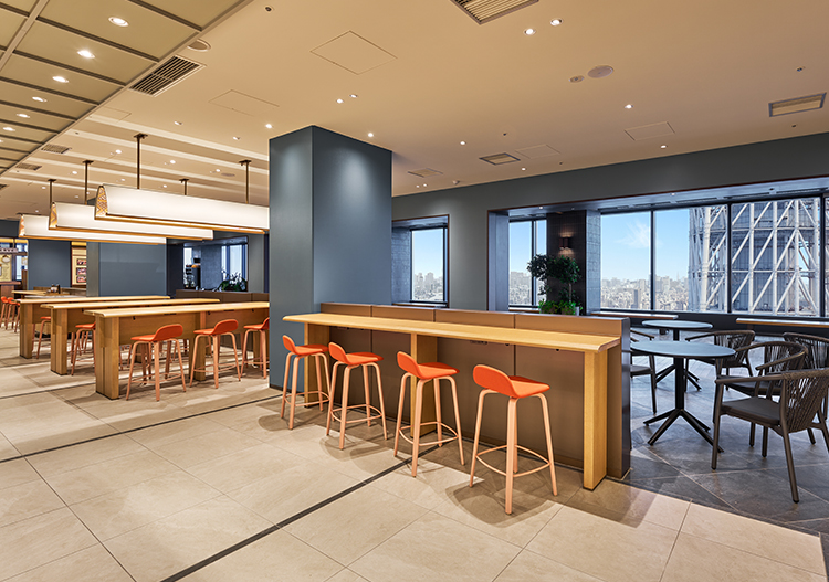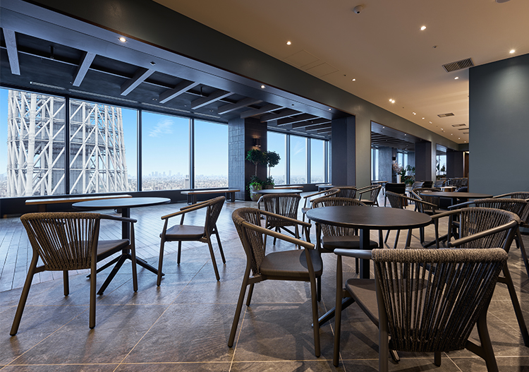 도쿄 스카이트리 ®를 정면으로 임하는 현장감 넘치는 스카이 라운지. 로맨틱한 공간에서 극상의 한때를.