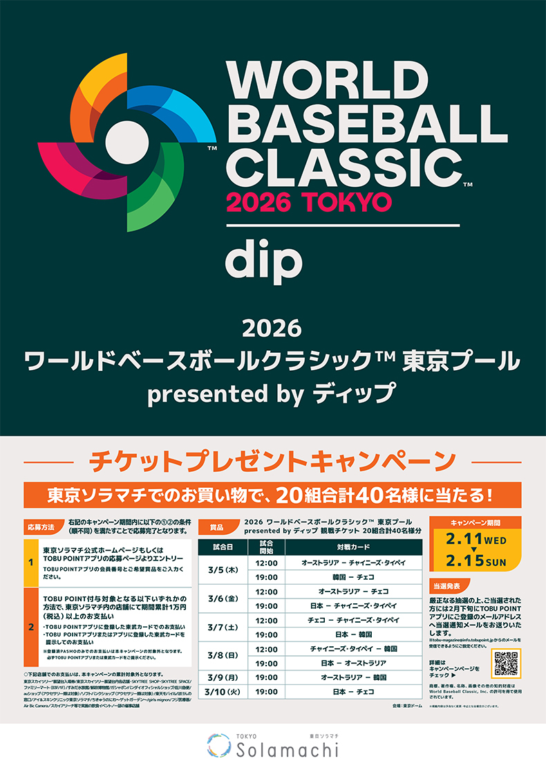 東京ソラマチのお買い物で「2026 ワールドベースボールクラシックTM 東京プールpresented by ディップ」観戦チケットを抽選で20組40名様にプレゼント!