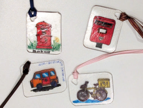 플라스틱 판에 포스트나 우편 배달용 오토바이 등, 우편에 관한 그림을 그리고 이름표의 매력을 만듭니다.
