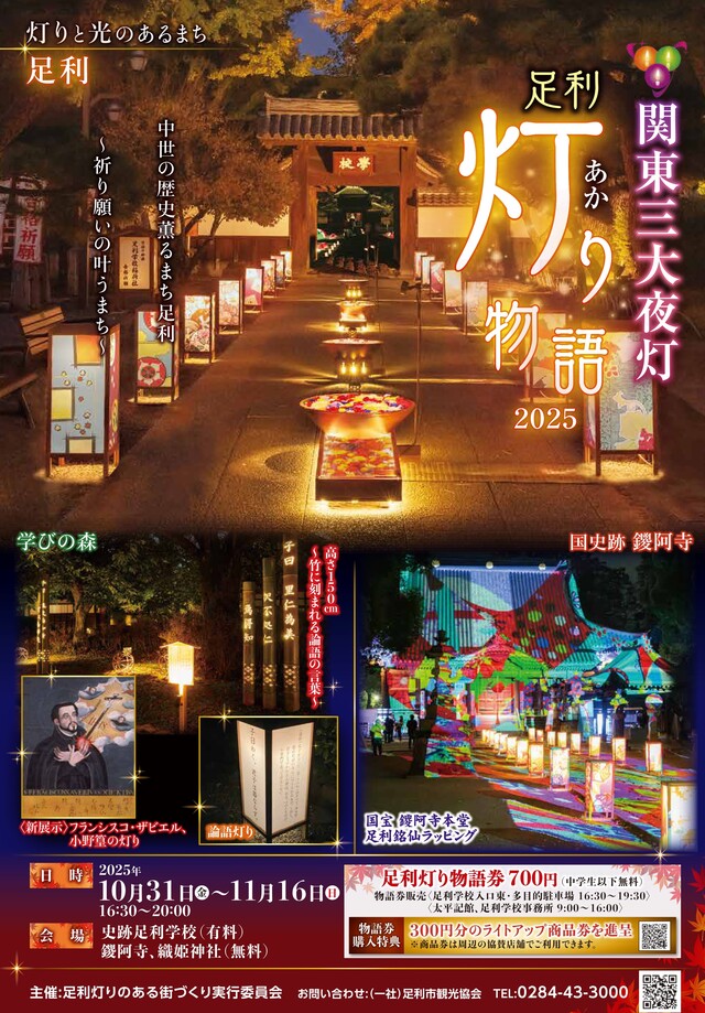 수도권에서 약 1시간 거리에 있습니다. 아시카가시는 현의 남서부에 위치하고 있으며, 역사와 문화, 자연이 적당히 교차합니다. 무로마치 막부를 개시한 아시카가 가문의 고향이며, 본당은 국보이며, 시내에는 아시카가 가문에 관련된 사찰과 신사가 많이 있습니다. 또한 일본 제1의 사적 아시카가 학교와 일본 3대 일루미네이션 꽃과 빛의 천국 '아시카가 플라워 파크' 등 다양한 풍경과 문화를 즐길 수 있습니다. 그리고 10/31(금)~11/16(일)에는 역사문화재와 거리를 조명으로 장식하는 가을의 대이벤트 '아시카가 등불 이야기 2025'가 개최됩니다.