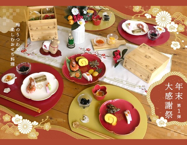 칸막이 무게에는 연기물의 학과 매화의 화분을 맞추어, 화려한 오세치를 즐길 수 있습니다.