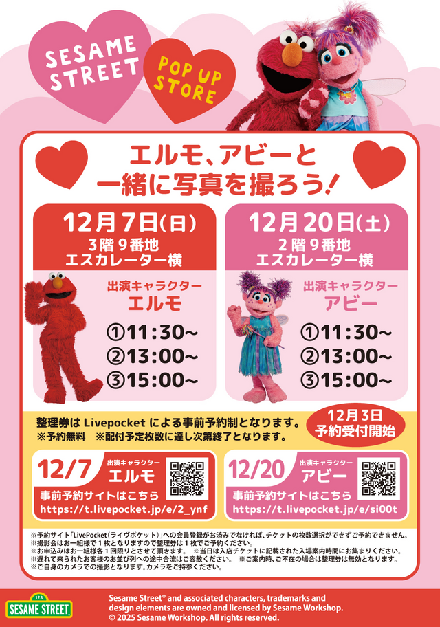 세서미 스트리트 팝업 스토어 환영 행사는 2025년 12월 7일 일요일에 열리며, 엘모를 만날 수 있고, 2025년 12월 20일 토요일에는 애비를 만날 수 있습니다.