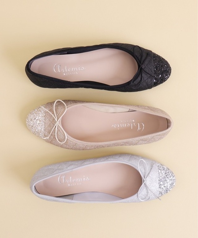 라메를 퀼팅 가공한 오리지날 소재와, 동계색의 대립 글리터의 조합이 화려한 발레 슈즈.