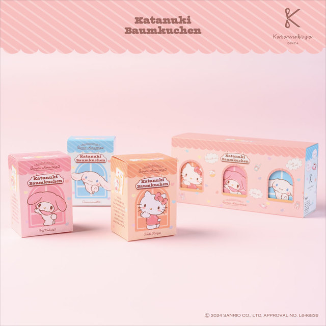 정성스럽게 구워지고 층층이 쌓인 카타누키야 자랑스러운 플랫 그릴드 바움쿠헨. 그 위에 멜랭으로 만든 쫄깃한 원단을 겹쳐 넣고, 귀엽고 정성껏 '헤이, 헤이, 물어봐 ♡'라는 문구가 새겨진 산리오 문자를 새겼습니다.