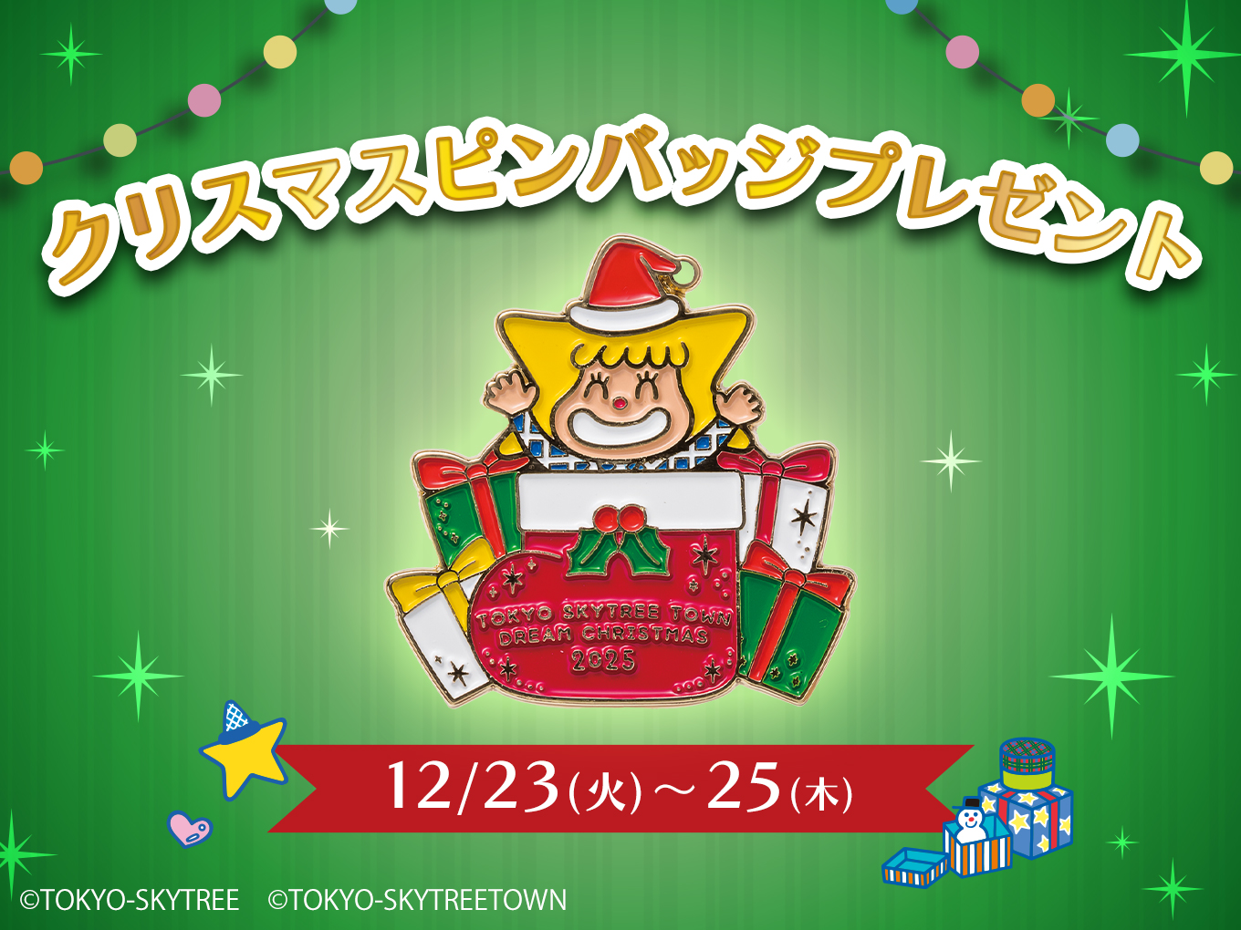 도쿄 스카이트리 타운 참가 점포에서 1회 1,000엔(부가세 포함) 이상 구입하신 분에게, 선착순으로 「크리스마스 핀 배지」를 1개 증정!